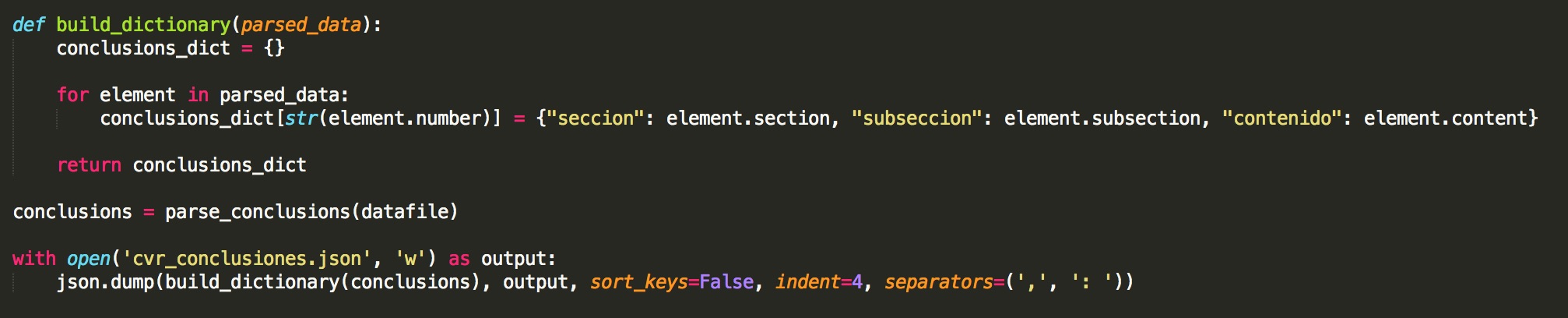 Con estos objetos, creamos un diccionario que contiene la totalidad de las conclusiones y sus atributos. Con este diccionario podríamos empezar ya a servir contenido directamente a un formato interactivo, por ejemplo utilizando un framework web como Flask. Por ahora, quiero solamente convertir este diccionario, que es un objeto nativo de Python, a un formato más universal como JSON. JSON es un formato sumamente común a través de la web, una forma de representar objetos de tal manera que pueden ser importados desde muchísimos lenguajes de programación, frameworks y bases de datos, convirtiéndolo en un formato ideal para compartir datos de manera que sean interoperables entre muchos sistemas.