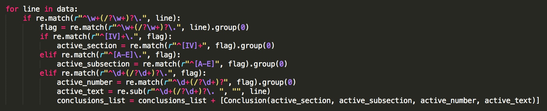 Este proceso empezó a partir de una versión en formato de texto de las Conclusiones. Sobre este formato, desprovisto de toda decoración o diagramado, fue posible utilizar un pequeño programa en Python para empezar a limpiar y ordenar la data. Las Conclusiones tienen una estructura bastante regular: las secciones empiezan con números romanos, las subsecciones con letras y cada conclusión está numerada. Utilizando expresiones regulares, el programa analiza el inicio de cada línea del archivo para determinar su naturaleza, y luego crea un objeto para cada conclusión incluyendo su número, su contenido, y la sección y subsección a la que pertenece.