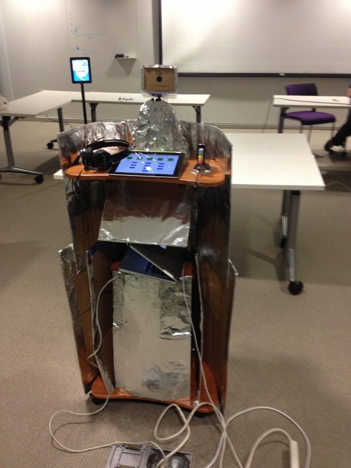 For its final presentation, both pieces were running of a Mac Mini concealed within a stand, “decorated” to appear as if it was a 1960s sci-fi B-movie prop (meaning, lots of aluminum foil). Using an app called Air Display, the mini was using an iPad as an external display with the AgNES GUI running, making it touch-enabled very easily. (I really wanted to try to get everything running off a Raspberry Pi but it proved to be too much for this iteration. The code for AgNES itself runs OK, but the computer vision and the text-to-speech stuff would’ve been more complicated to pull off, though not impossible – just needed more time!).