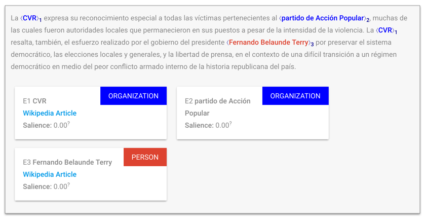 Hace unas semanas, Google lanzó una nueva API para procesamiento de lenguaje natural que hace disponible su motor de machine learning al público de manera relativamente sencilla. Utilizando esta API, podemos analizar cualquier bloque de texto para hacer reconocimiento de entidades: identificar personas, organizaciones, eventos o lugares que son mencionados en un texto. De esta manera podemos tomar el texto de las Conclusiones y destacar elementos importantes de manera automática --- algo que, para un lector neófito, puede facilitar enormemente la lectura pues ayuda brindando contexto al contenido (por ejemplo, identificando que "Alan García" es una persona o que "Ayacucho" es un lugar, y creando un enlace a la referencia correspondiente en Wikipedia).