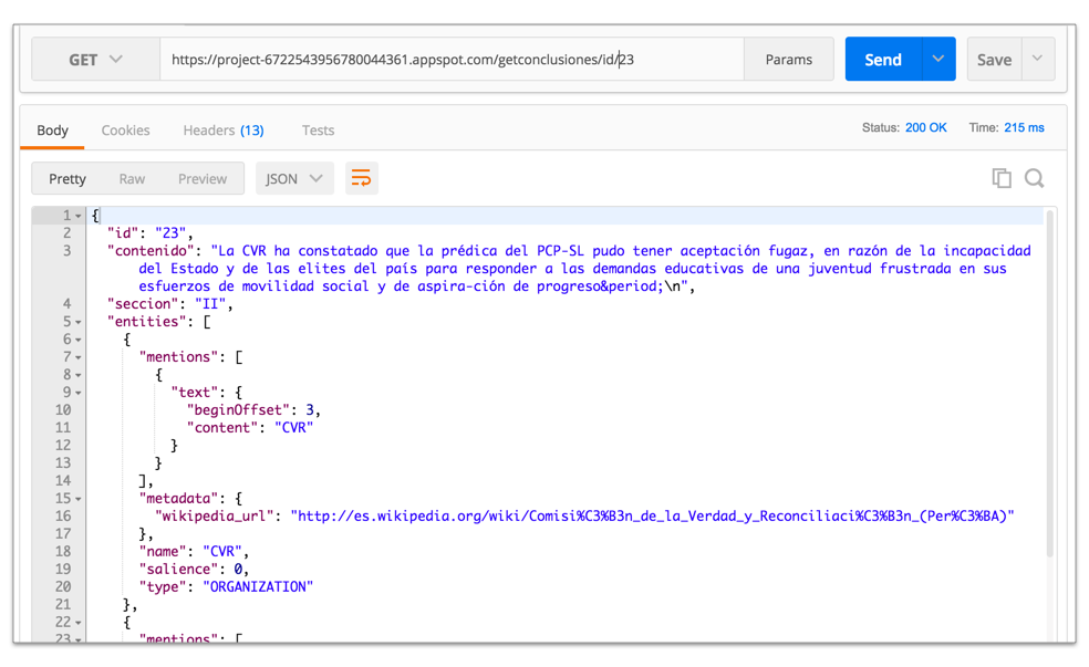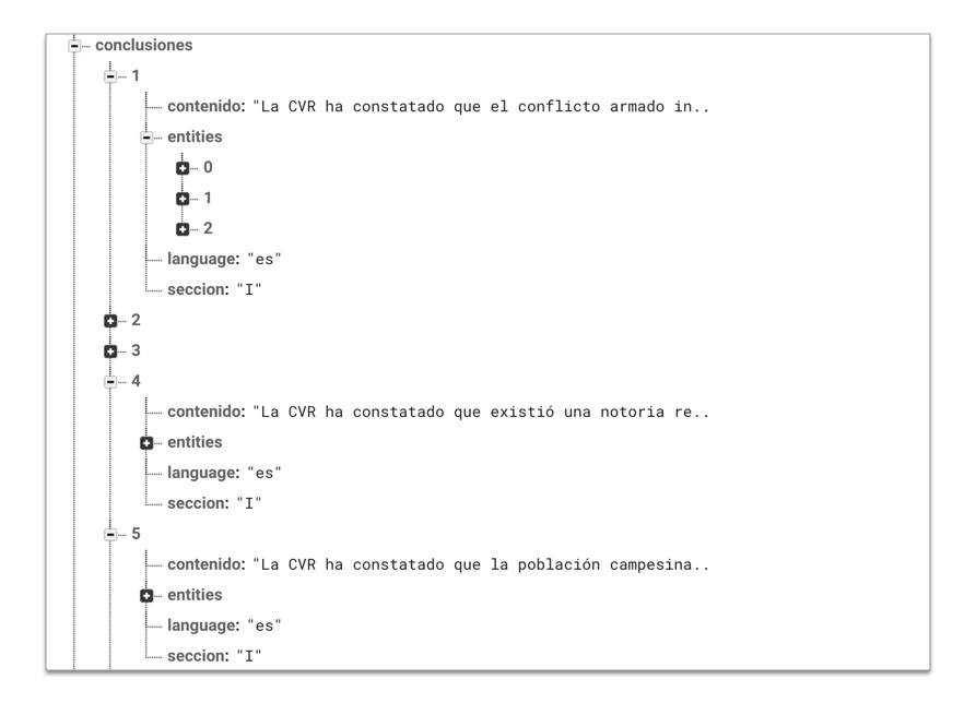 La llamada que hace la aplicación web a la API recibe la información de las entidades contenidas en el texto. Una primera versión con todas las Conclusiones ya está disponible . Aún no he terminado de agregar los campos para que se reflejan en la interfaz, pero una vez que hecha la conexión, el texto de cada conclusión vendrá de la mano con las entidades identificadas y los enlaces que aportan contexto a la lectura. De la misma manera, pueden en el futuro agregarse enlaces a artículos, contenido multimedia, y cualquier tipo de información complementaria que ayude a brindar contexto.