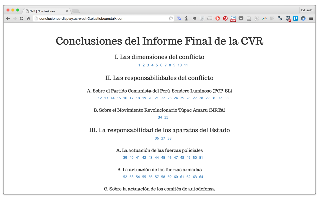 Este fin de semana largo he tenido tiempo para seguir avanzando el trabajo que empecé hace tiempo con la digitalización del Informe Final de la Comisión de la Verdad y la Reconciliación . Soy de la idea de que un documento de tal magnitud como el IF tiene que tener una representación digital que facilite su análisis, su procesamiento, su difusión y, sobre todo, su discusión. Pero a pesar de que se presentó hace apenas trece años, el IF no cuenta con una buena versión digital o interactiva: fue pensado, preparado y finalmente publicado bajo la lógica del documento impreso.